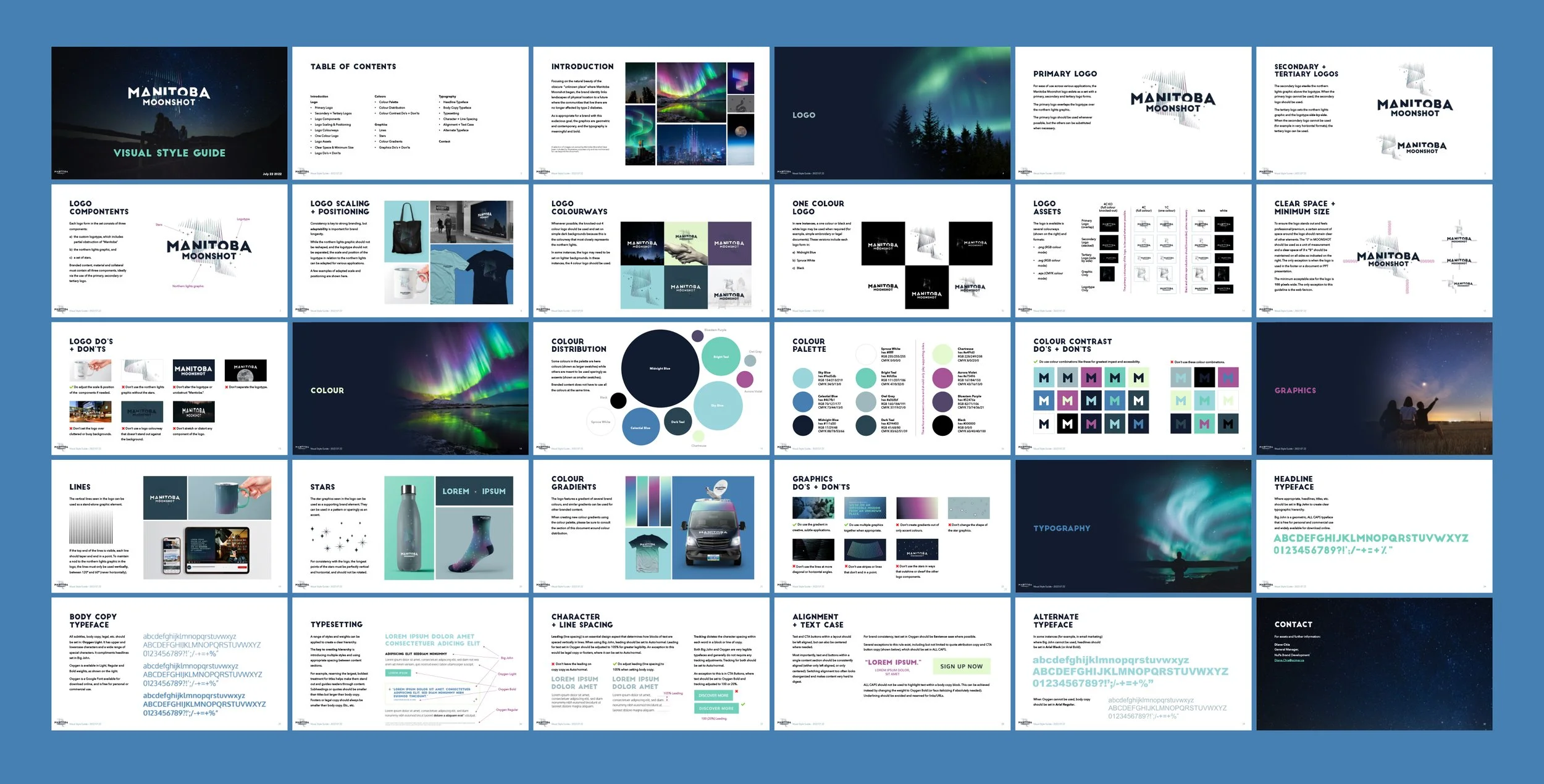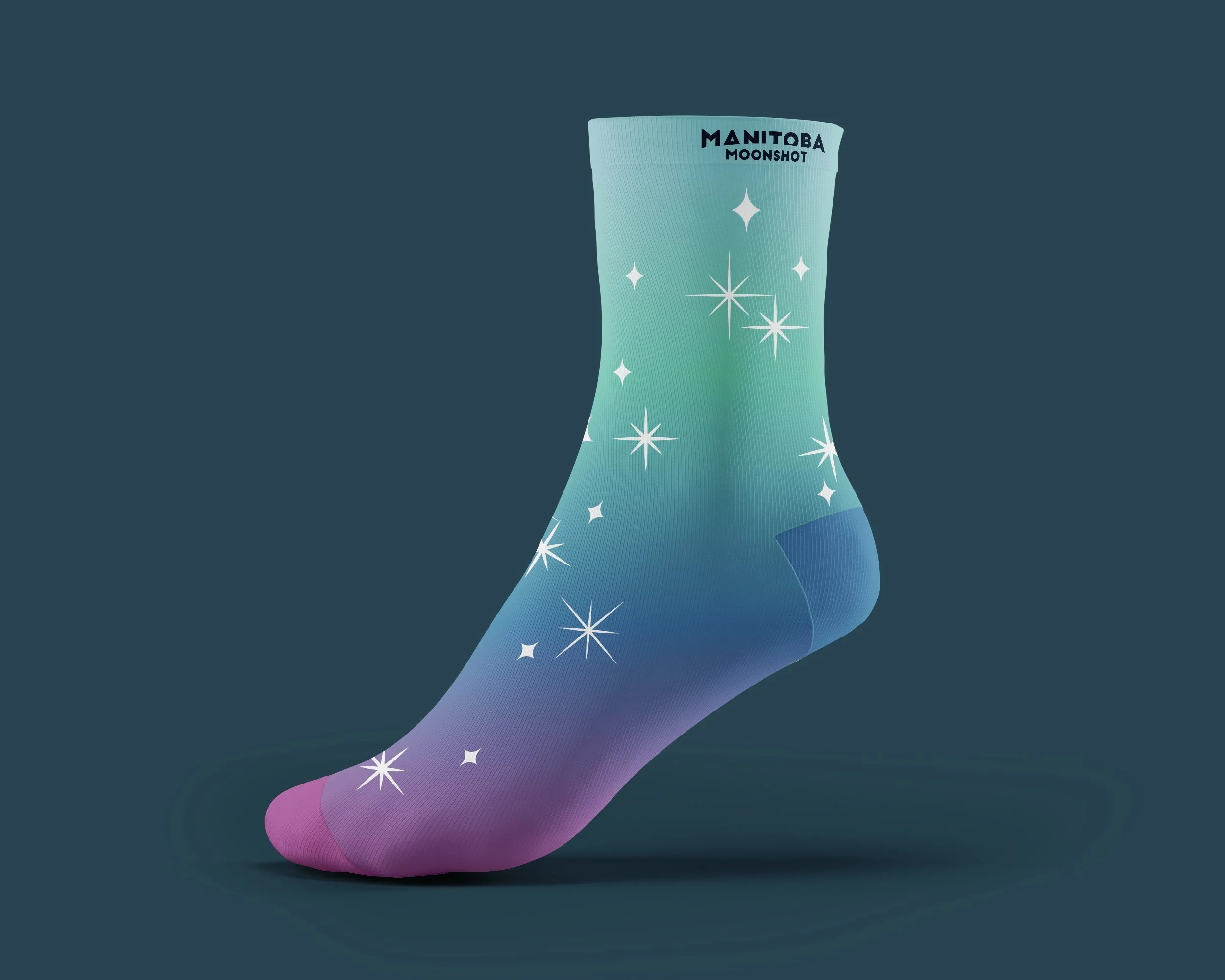 A style guide was developed to advise on use of brand assets that was consistent, playful, and highly adaptable (multiple versions of the logo were created for different colour ways, different compositions, and with different scaled details). To support the logo and typography, various graphics were created to round out the brand; stars, line patterns, and multiple colour gradients offered endless possibilities for ways Manitoba Moonshot could manifest on and offline.